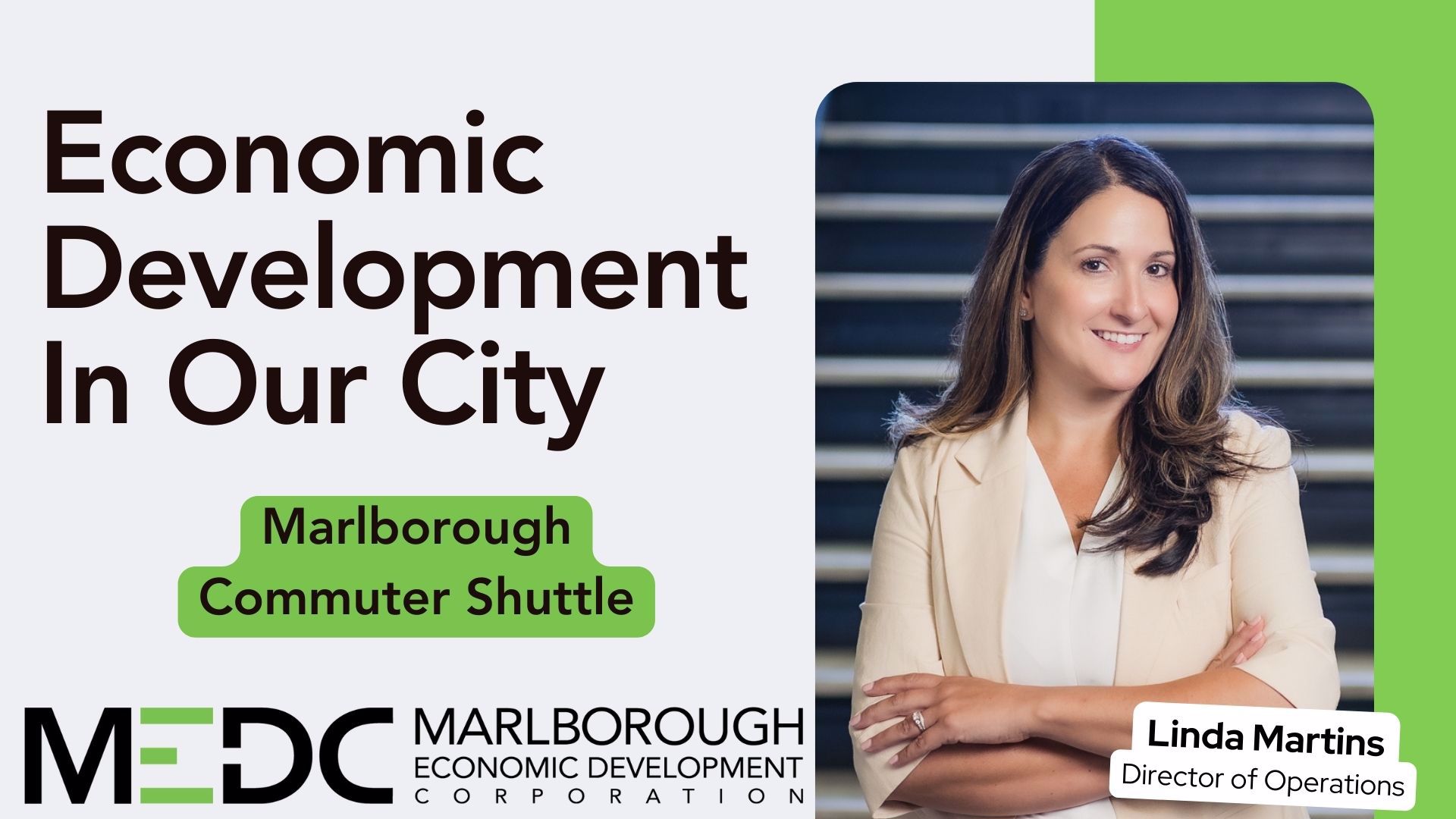 Economic Development In Our City features Linda Martins, Director of Operations at MEDC, as she discusses the Marlborough Commuter Shuttle, a free transportation option for Marlborough residents and employees, looking to get to and from the Southborough Commuter Rail Station.