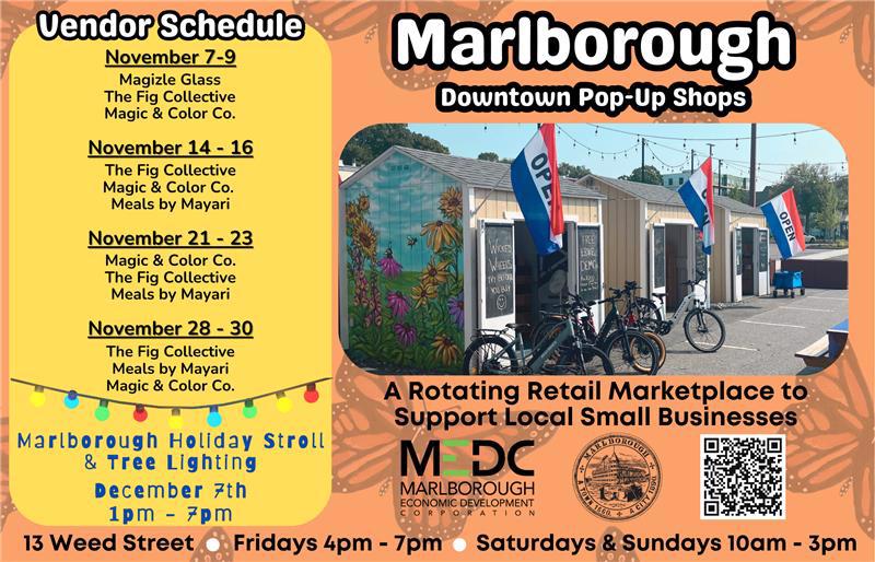 The Marlborough Downtown Pop-Up Shops are open every Friday from 4-7pm and Saturday and Sunday from 10am-3pm through December. Join us in supporting a rotating schedule of unique vendors, makers, and creators as they expand their brands downtown in temporary storefronts.