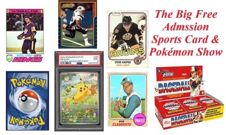 On March 8, the Big Free Admission Sports Card & Pokémon Show will take place from 10 AM to 6 PM at Solomon Pond Mall in Marlborough. The event features 157 vendor tables where attendees can buy, sell, and trade sports cards, Pokémon and other trading cards, memorabilia, and more. There will also be free autograph opportunities with special guests including former Boston Bruin Steve Kaper, Patriots three-time champion Patrick Pass, and Hockey Hall of Famer Marcel Dionne. |